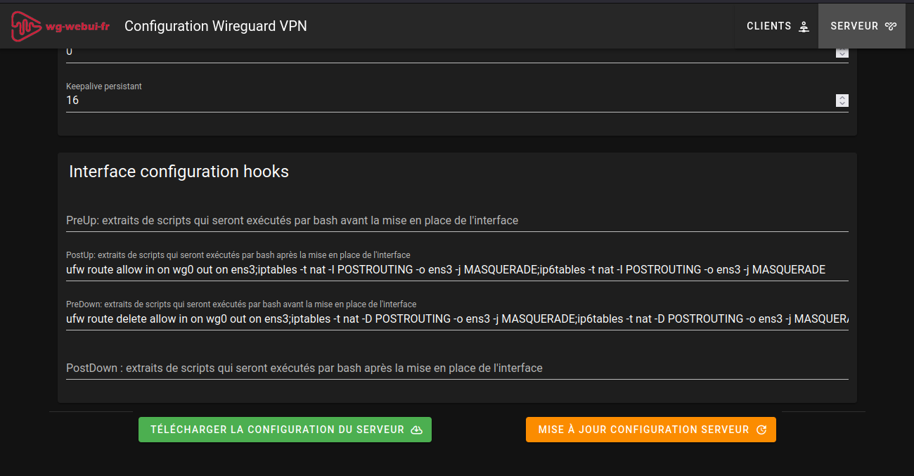 Après le premier lancement, Wg Gen Web créera le fichier server.json dans le répertoire défini le paramètre WG_INTERFACE_NAME du fichier environnement.
